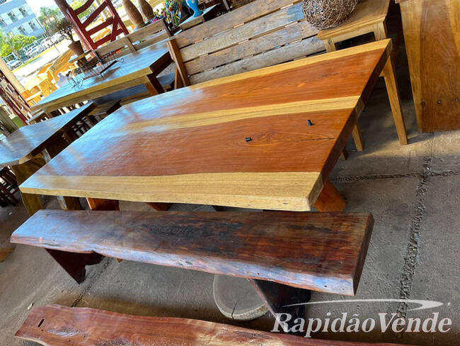 01- (UM) - CONJUNTO DE MÓVEIS DE MADEIRA COMPOSTO DE UMA MESA TAMANHO, MEDINDO 1,2M X 2,5M (LARG. X COMP.) ACOMPANHADO DE 02 BANCOS GRANDES DE MADEIRA EM BOM ESTADO DE CONSERVAÇÃO SENDO ITEM NOVO.