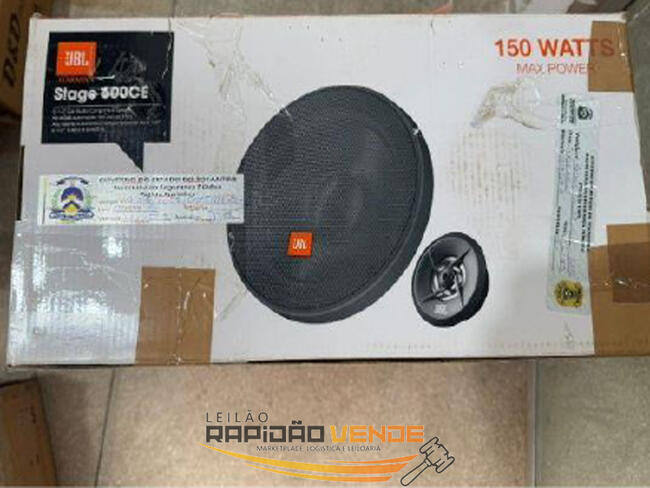 05 (CINCO) CAIXA DE SOM, COR PRETA, MARCA JBL, MODELO STAGE 600CE, 150W MAX POWER, NÚMEROS DE SÉRIES EV0103-HI0030059, EV0103-FI0027984, EV0103-JH0016911, EV0103-IH0016052, EV0103-IH0016007. OBJETOS NAS CAIXAS, APARENTEMENTE SEM USO E ÓTIMO ESTADO DE CONSERVAÇÃO, VALOR UNITÁRIO R$ 250,00 (DUZENTOS E CINQUENTA REAIS).