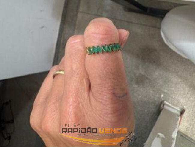 01 (UMA) ALIANÇA EM OURO AMARELO, COM 08 PEDRAS NA COR VERDE. AVALIADO EM R$ R$ 690,00 (SEISCENTOS E NOVENTA REAIS);